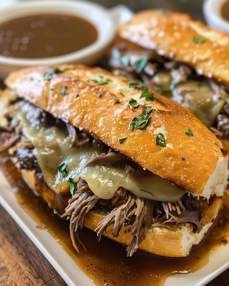 - Ladle some of the beef au jus into small bowls for dipping, and serve immediately.